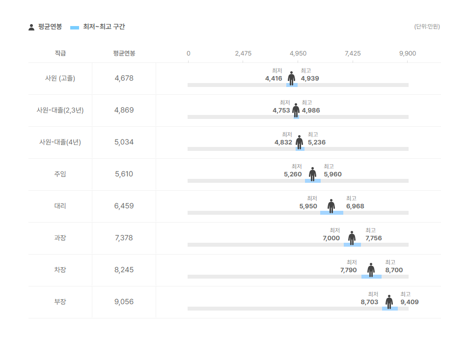 부장 연봉 9,056만원, 차장 연봉 8,245만원, 과장 연봉 7,378만원, 대리 연봉 6,459만원 이라고 합니다.