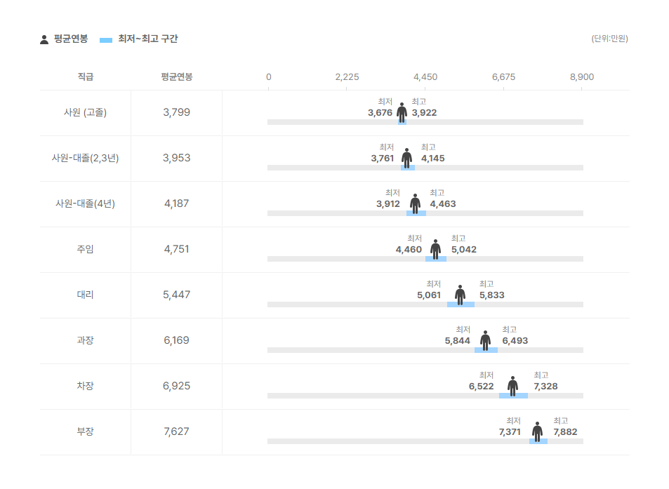 부장 연봉 7,627만원, 차장 연봉 6,925만원, 과장 연봉 6,169만원, 대리 연봉 5,447만원 이라고 합니다.