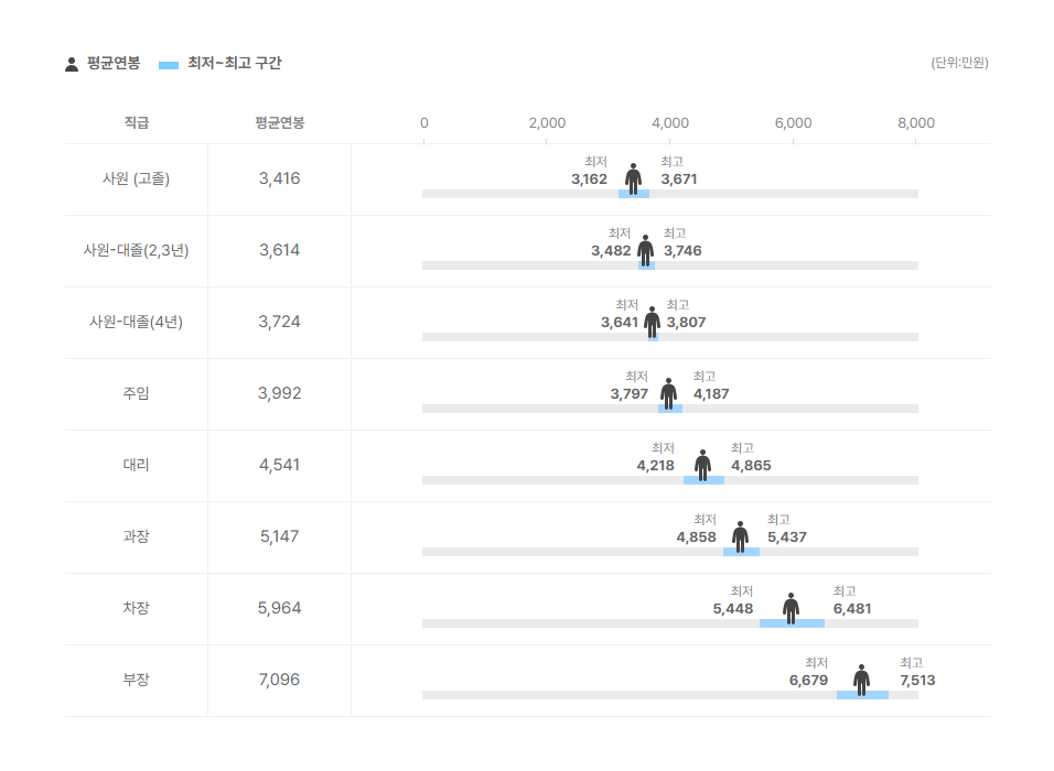 부장 연봉 7,096만원, 차장 연봉 5,964만원, 과장 연봉 5,147만원, 대리 연봉 4,541만원 이라고 합니다.