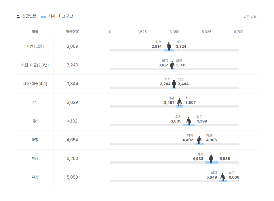 부장 연봉 5,858만원, 차장 연봉 5,260만원, 과장 연봉 4,654만원, 대리 연봉 4,102만원 이라고 합니다.