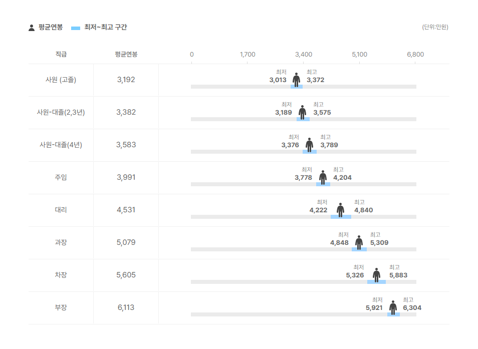 부장 연봉 6,113만원, 차장 연봉 5,605만원, 과장 연봉 5,079만원, 대리 연봉 4,531만원 이라고 합니다.