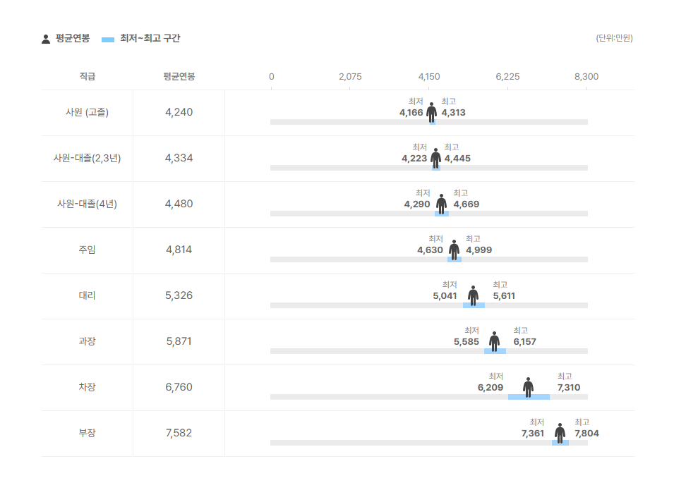 부장 연봉 7,532만원, 차장 연봉 6,760만원, 과장 연봉 5,871만원, 대리 연봉 5,326만원 이라고 합니다.