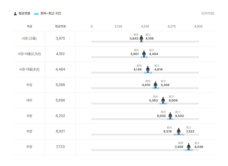 부장 연봉 7,723만원, 차장 연봉 6,921만원, 과장 연봉 6,252만원, 대리 연봉 5,696만원 이라고 합니다.