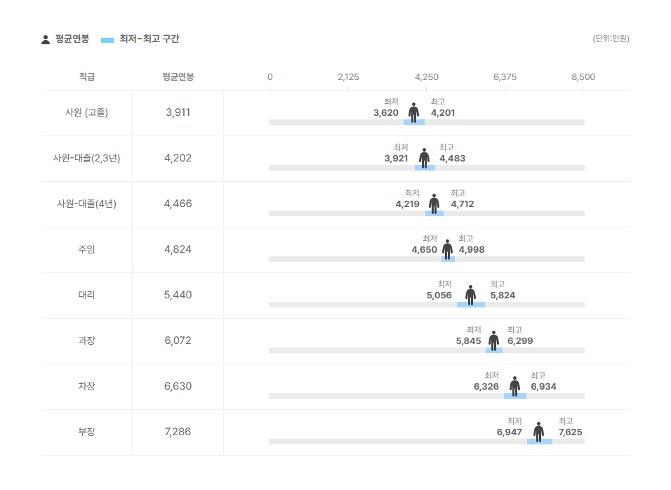 부장 연봉 7,286만원, 차장 연봉 6,630만원, 과장 연봉 6,072만원, 대리 연봉 5,440만원 이라고 합니다.