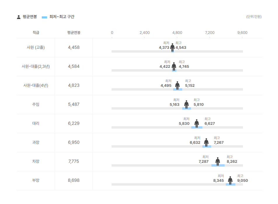 부장 연봉 8,698만원, 차장 연봉 7,775만원, 과장 연봉 6,950만원, 대리 연봉 6,229만원 이라고 합니다.
