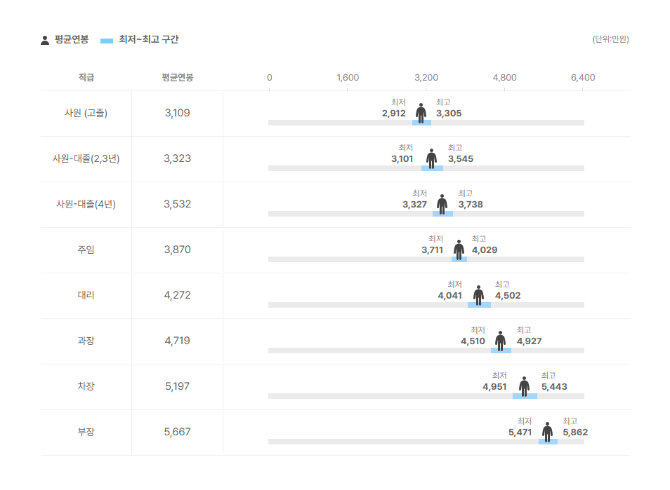 부장 연봉 5,667만원, 차장 연봉 5,197만원, 과장 연봉 4,719만원, 대리 연봉 4,272만원 이라고 합니다.