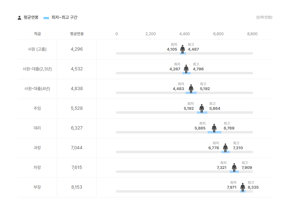 부장 연봉 8,153만원, 차장 연봉 7,615만원, 과장 연봉 7,044만원, 대리 연봉 6,327만원 이라고 합니다.
