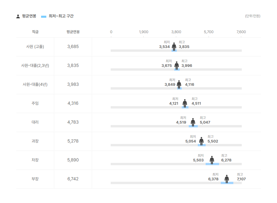 부장 연봉 6,742만원, 차장 연봉 5,890만원, 과장 연봉 5,278만원, 대리 연봉 4,783만원 이라고 합니다.