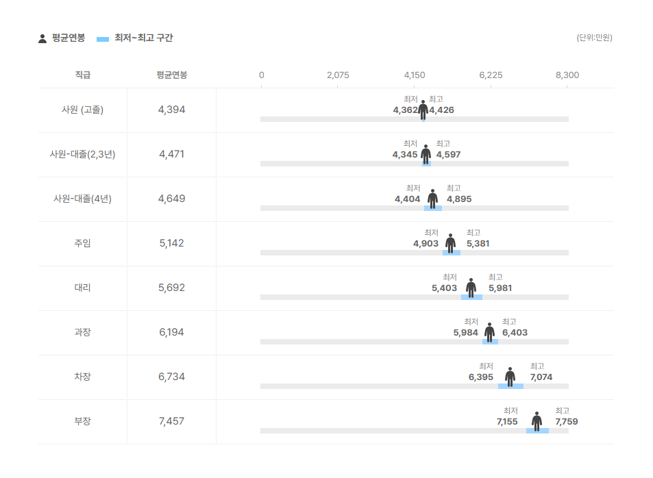부장 연봉 7,457만원, 차장 연봉 6,734만원, 과장 연봉 6,194만원, 대리 연봉 5,692만원 이라고 합니다.