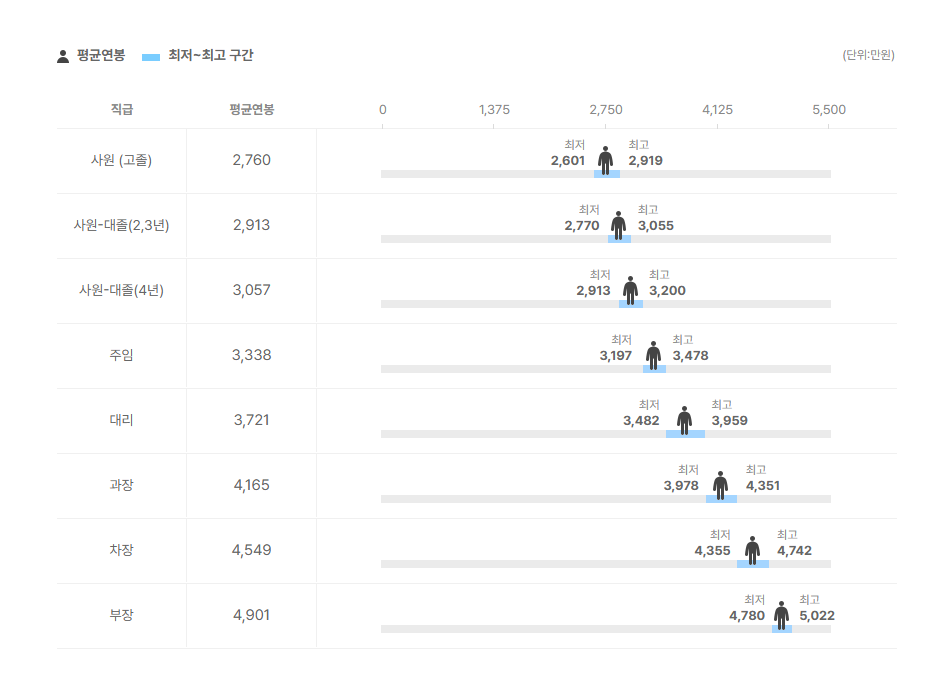 부장 연봉 4,901만원, 차장 연봉 4,549만원, 과장 연봉 4,165만원, 대리 연봉 3,721만원 이라고 합니다.