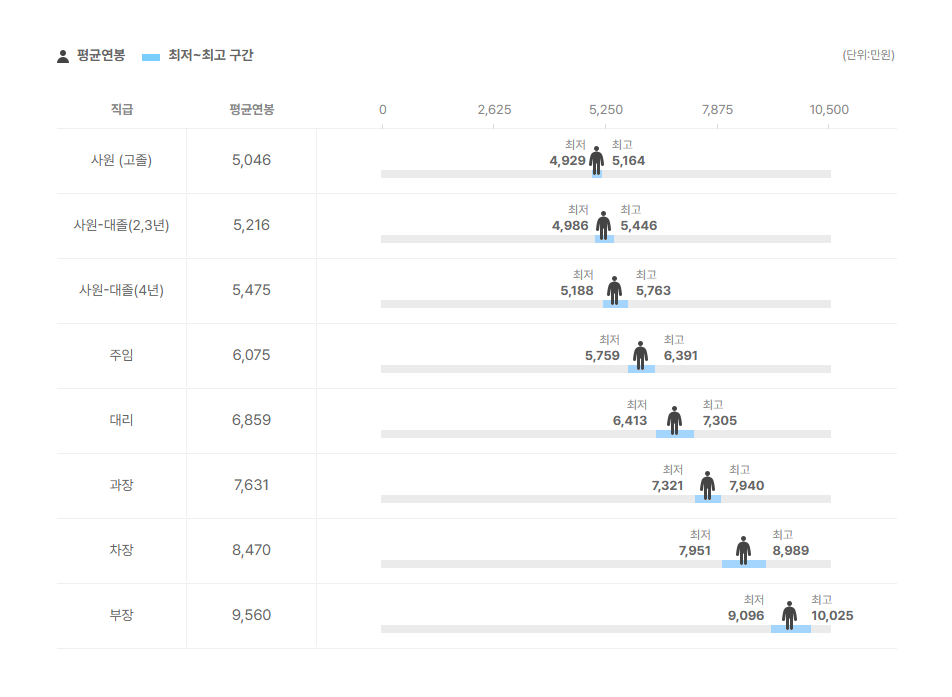부장 연봉 9,560만원, 차장 연봉 8,470만원, 과장 연봉 7,631만원, 대리 연봉 6,859만원 이라고 합니다.