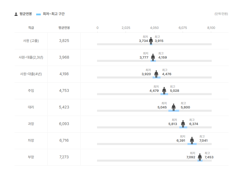 부장 연봉 7,273만원, 차장 연봉 6,716만원, 과장 연봉 6,093만원, 대리 연봉 5,423만원 이라고 합니다.