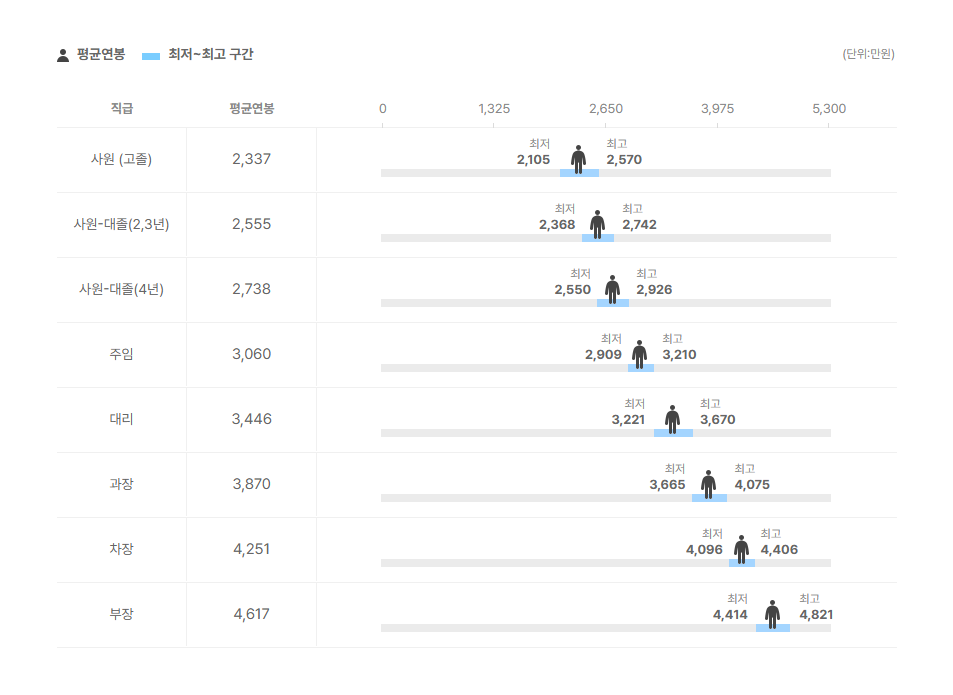 부장 연봉 4,617만원, 차장 연봉 4,251만원, 과장 연봉 3,870만원, 대리 연봉 3,446만원 이라고 합니다.