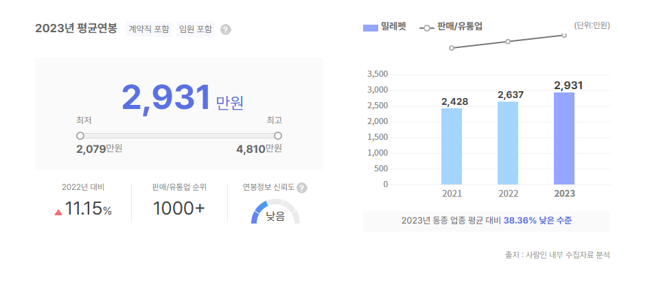 밀레펫 대졸초임 초봉을 확인해보니 2,638만원으로 확인되었습니다.