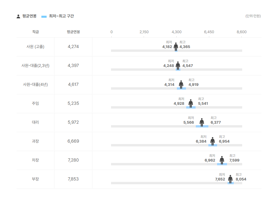 부장 연봉 7,853만원, 차장 연봉 7,280만원, 과장 연봉 6,699만원, 대리 연봉 5,972만원 이라고 합니다.