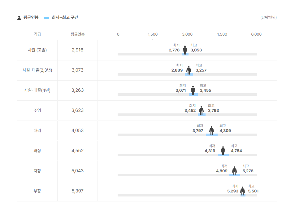 부장 연봉 5,397만원, 차장 연봉 5,043만원, 과장 연봉 4,552만원, 대리 연봉 4,053만원 이라고 합니다.