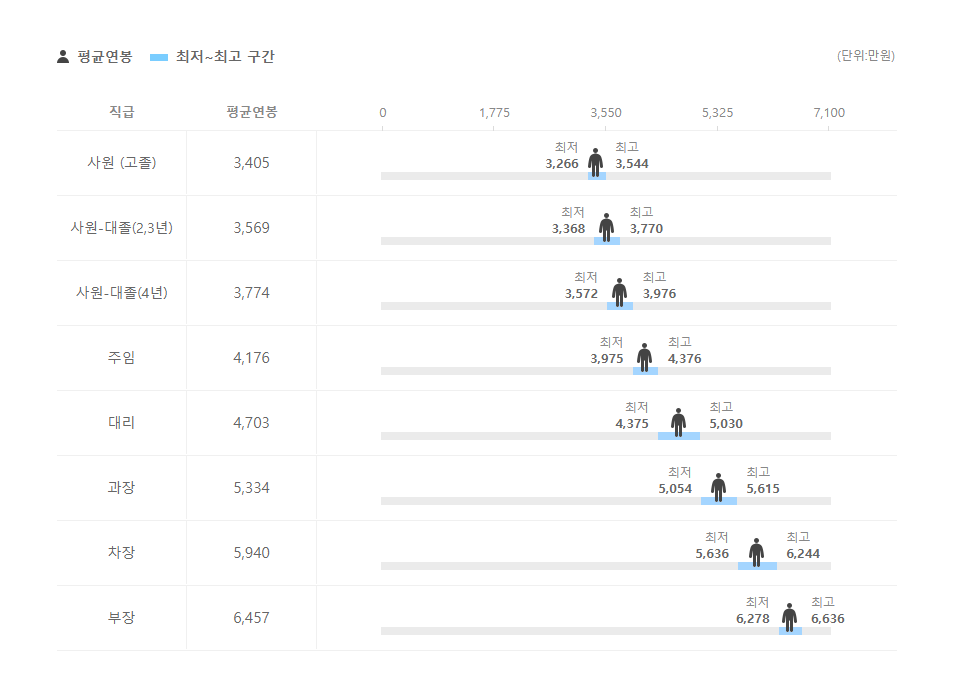 부장 연봉 6,457만원, 차장 연봉 5,940만원, 과장 연봉 5,334만원, 대리 연봉 4,703만원 이라고 합니다.