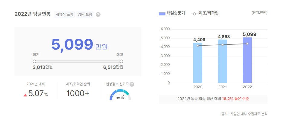 연도별 평균 연봉도 확인할 수 있었는데요. 확인된 금액은 2022년도 기준 5,099만원 이라고 하네요.