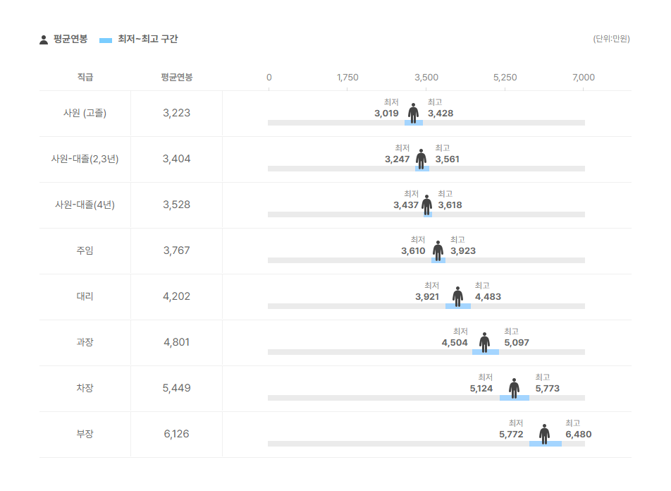부장 연봉 6,126만원, 차장 연봉 5,449만원, 과장 연봉 4,801만원, 대리 연봉 4,202만원 이라고 합니다.