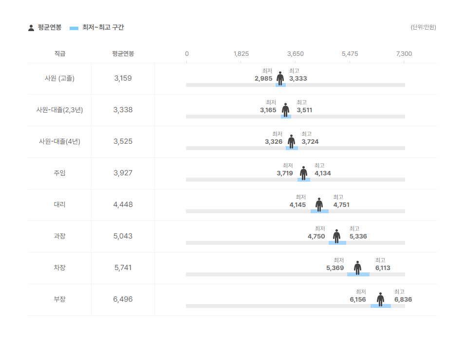 부장 연봉 6,496만원, 차장 연봉 5,741만원, 과장 연봉 5,043만원, 대리 연봉 4,448만원 이라고 합니다.