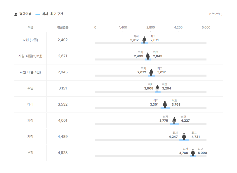 부장 연봉 4,928만원, 차장 연봉 4,489만원, 과장 연봉 4,001만원, 대리 연봉 3,532만원 이라고 합니다.
