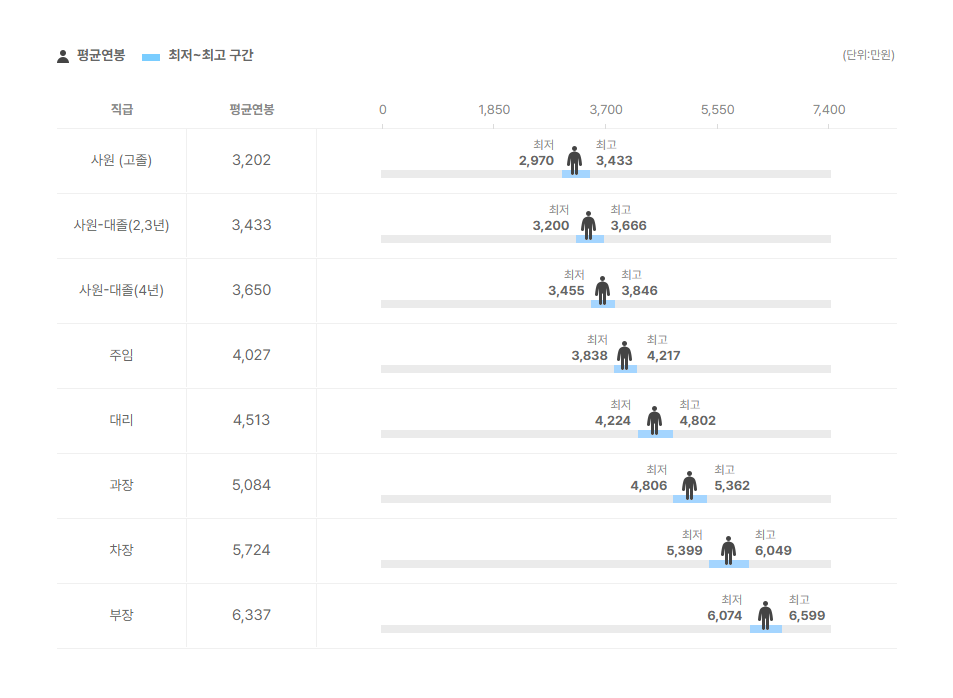 부장 연봉 6,337만원, 차장 연봉 5,724만원, 과장 연봉 5,084만원, 대리 연봉 4,513만원 이라고 합니다.