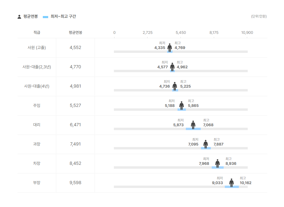 부장 연봉 9,598만원, 차장 연봉 8,452만원, 과장 연봉 7,491만원, 대리 연봉 6,471만원 이라고 합니다.