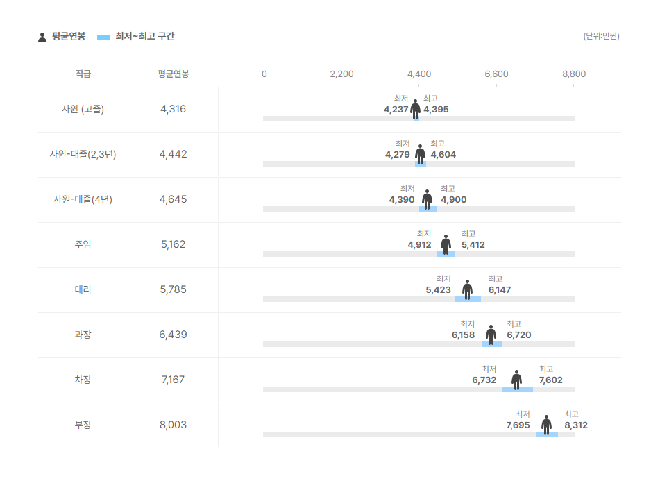 부장 연봉 8,003만원, 차장 연봉 7,167만원, 과장 연봉 6,439만원, 대리 연봉 5,785만원 이라고 합니다.