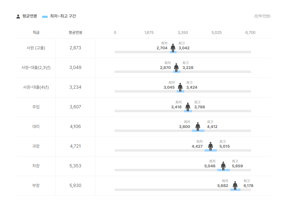 부장 연봉 5,930만원, 차장 연봉 5,353만원, 과장 연봉 4,721만원, 대리 연봉 4,106만원 이라고 합니다.
