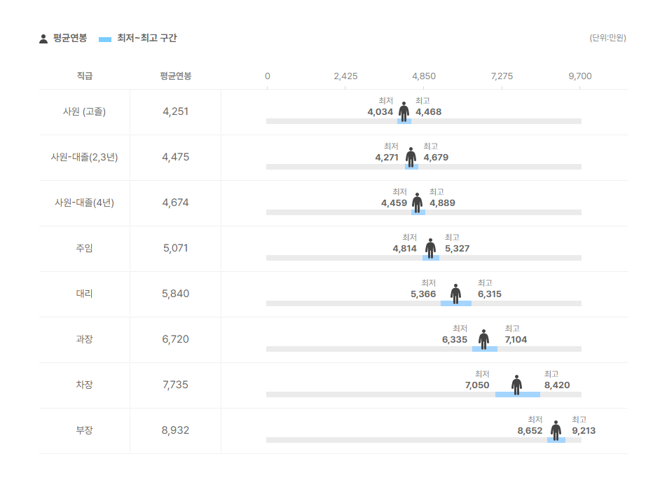 부장 연봉 8,932만원, 차장 연봉 7,735만원, 과장 연봉 6,720만원, 대리 연봉 5,840만원 이라고 합니다.