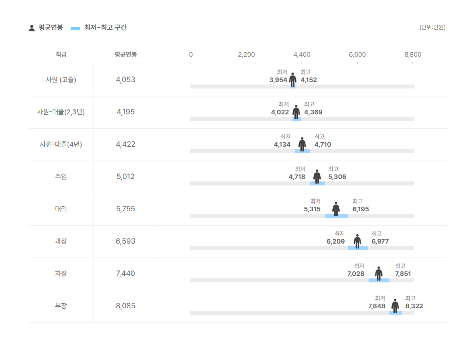 부장 연봉 8,085만원, 차장 연봉 7,440만원, 과장 연봉 6,593만원, 대리 연봉 5,755만원 이라고 합니다.
