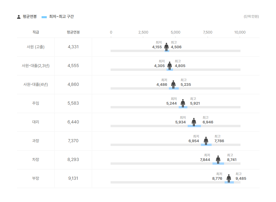 부장 연봉 9,131만원, 차장 연봉 8,293만원, 과장 연봉 7,370만원, 대리 연봉 6,440만원 이라고 합니다.
