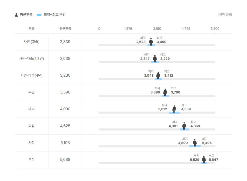부장 연봉 5,688만원, 차장 연봉 5,193만원, 과장 연봉 4,625만원, 대리 연봉 4,090만원 이라고 합니다.