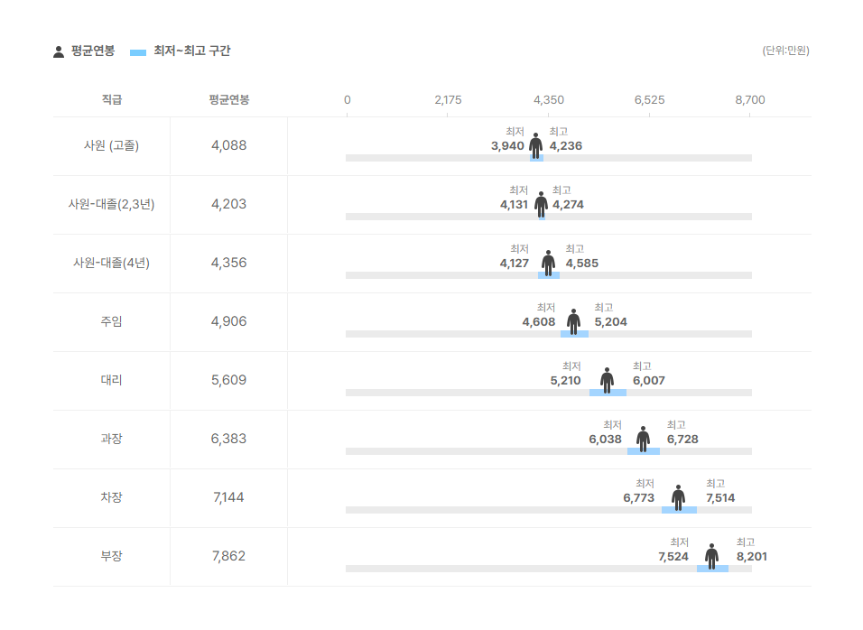 부장 연봉 7,862만원, 차장 연봉 7,144만원, 과장 연봉 6,383만원, 대리 연봉 5,609만원 이라고 합니다.